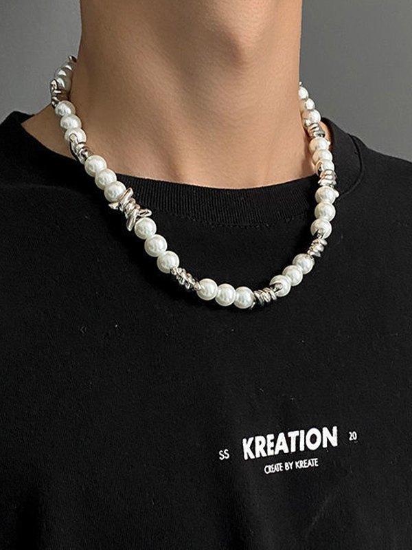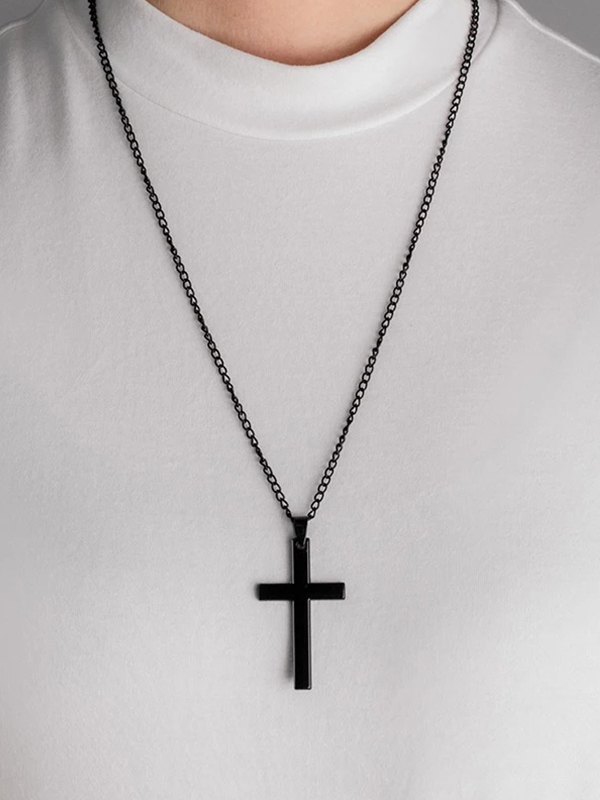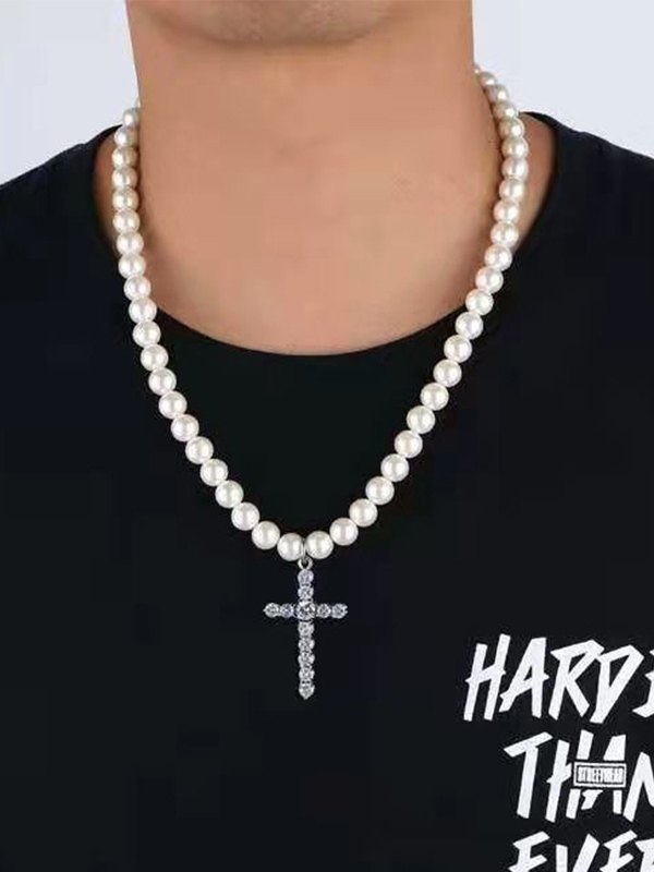 Men’s Rhinestone Cross Pendant Faux Pearl Necklace