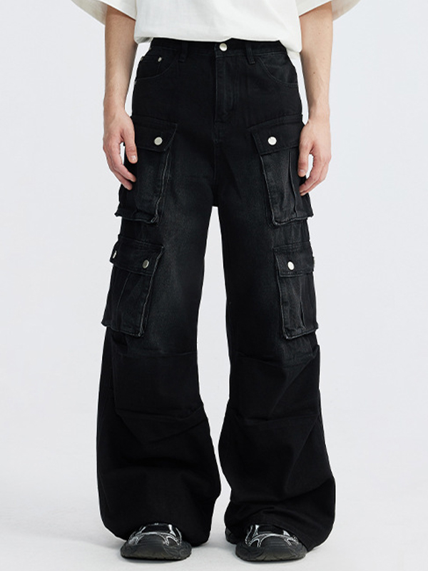 Retro Washed Distressed Multiple Pockets Cargo Jeans