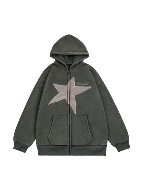 Polar Fleece Star Embroidered Zip Up Oversized Hoodie