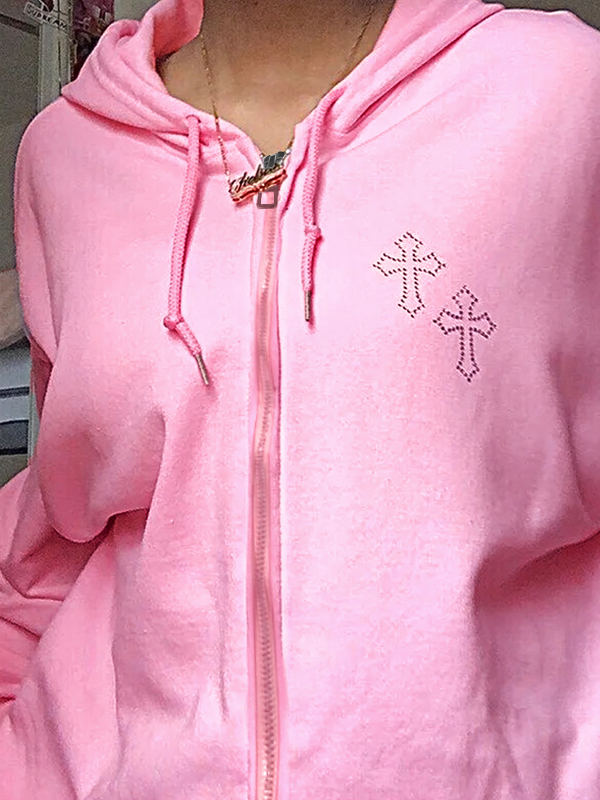 Vintage Cross Rhinestone Print Zip Up Oversized Hoodie