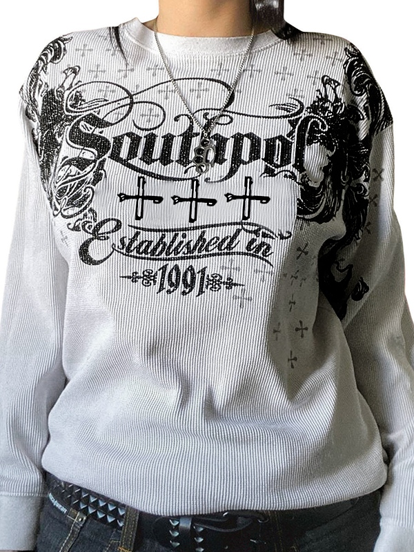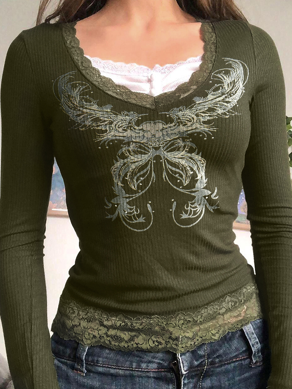 Vintage Graphic Print Lace Trim Splice Long Sleeve Knit