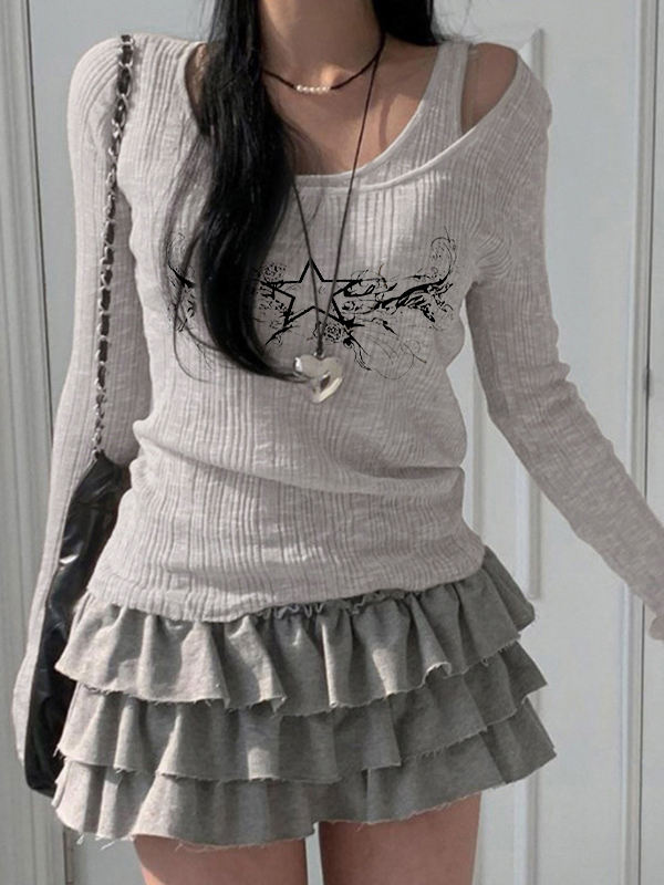 Solid Color Rib Lace Trim Slim Long Sleeve Knit