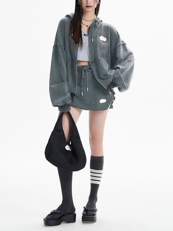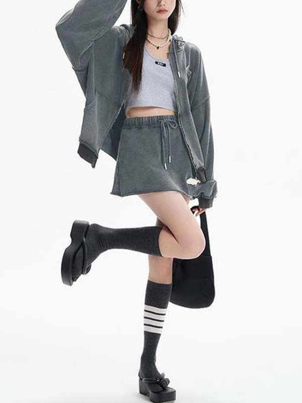 Distressed Washed Double Zip Hoodie&Frayed Hem Skirt Set