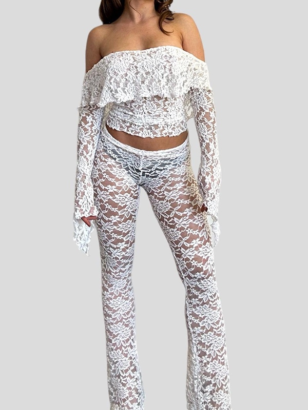 Lace Off Shoulder Long Sleeve Tee&Flared Pants Set