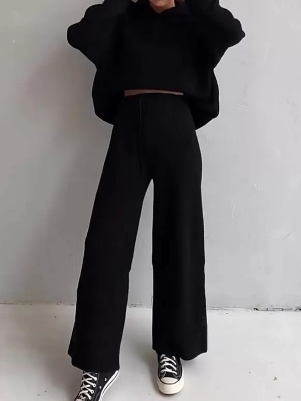 Solid Oversized Hoodie&Drawstring Wide Leg Pants Set