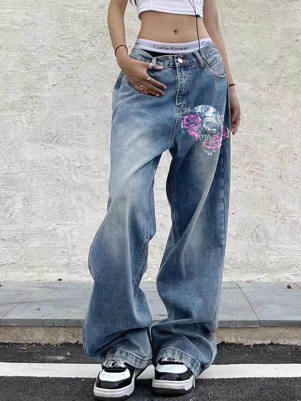 Skull Rose Print Vintage Blue Wide Leg Boyfriend Jeans